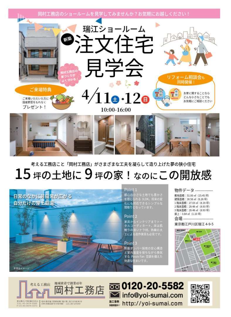15坪の土地に9坪の家!なのにこの開放感。考える工務店こと「岡村工務店」がさまざまな工夫を凝らして造り上げた夢の狭小住宅をぜひ見に来てください!