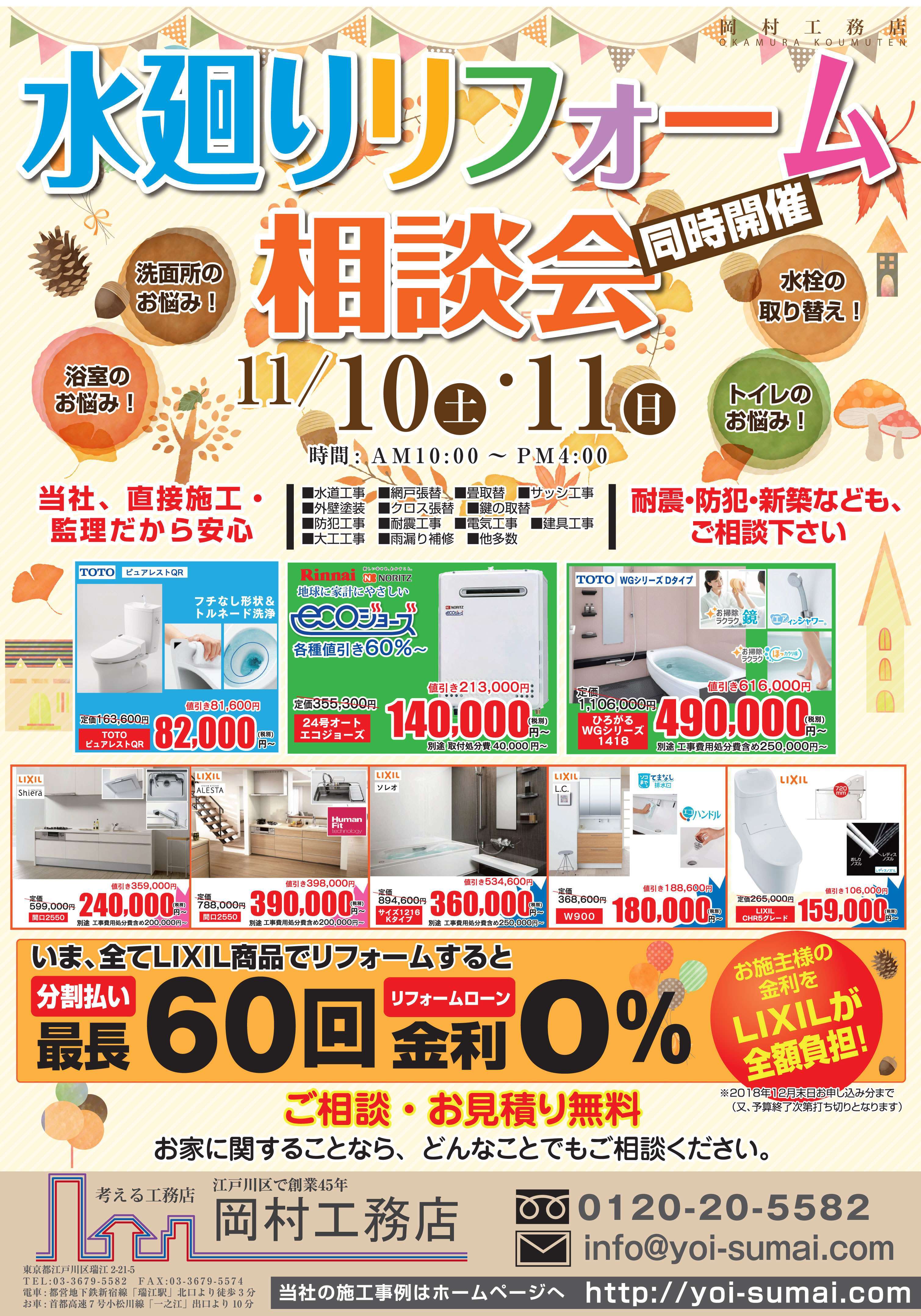 11月10日(土)・11日(日)の2日間当社ショールームにて見学会、リフォーム水廻り相談会を開催します。お家の事で気になる事。。。困った事など。。。ございましたらこの機会に是非ご来場ください。当日は、心ばかりの粗品(野菜)をご用意してお待ちしております。お散歩ついでにお気軽にご来場ください。