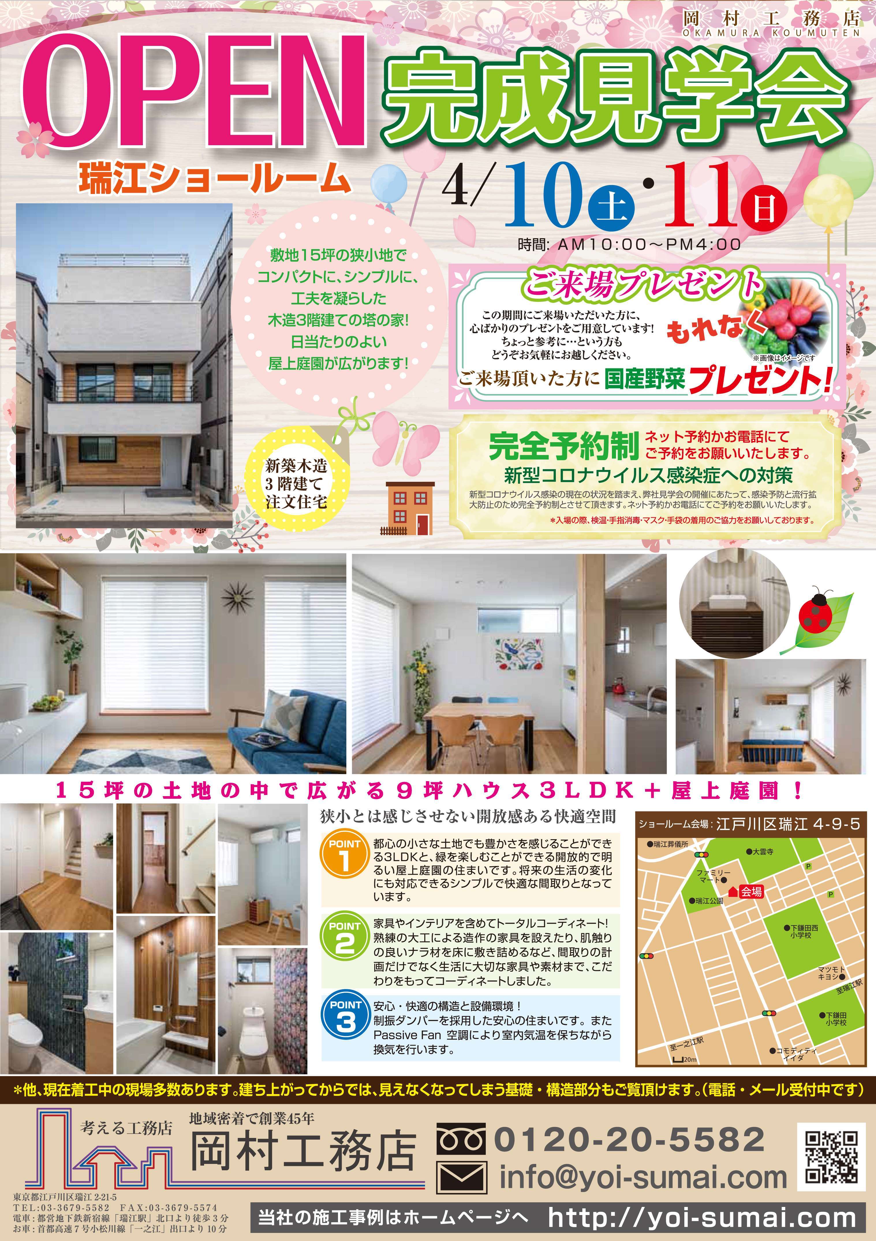 4月10日(土)・11日(日)2日間当社瑞江ショールームにて完成見学会、リフォーム相談会を開催します。15坪の敷地に、建坪9坪のお家+屋上庭園。9坪でゆとりある住空間が・・・。