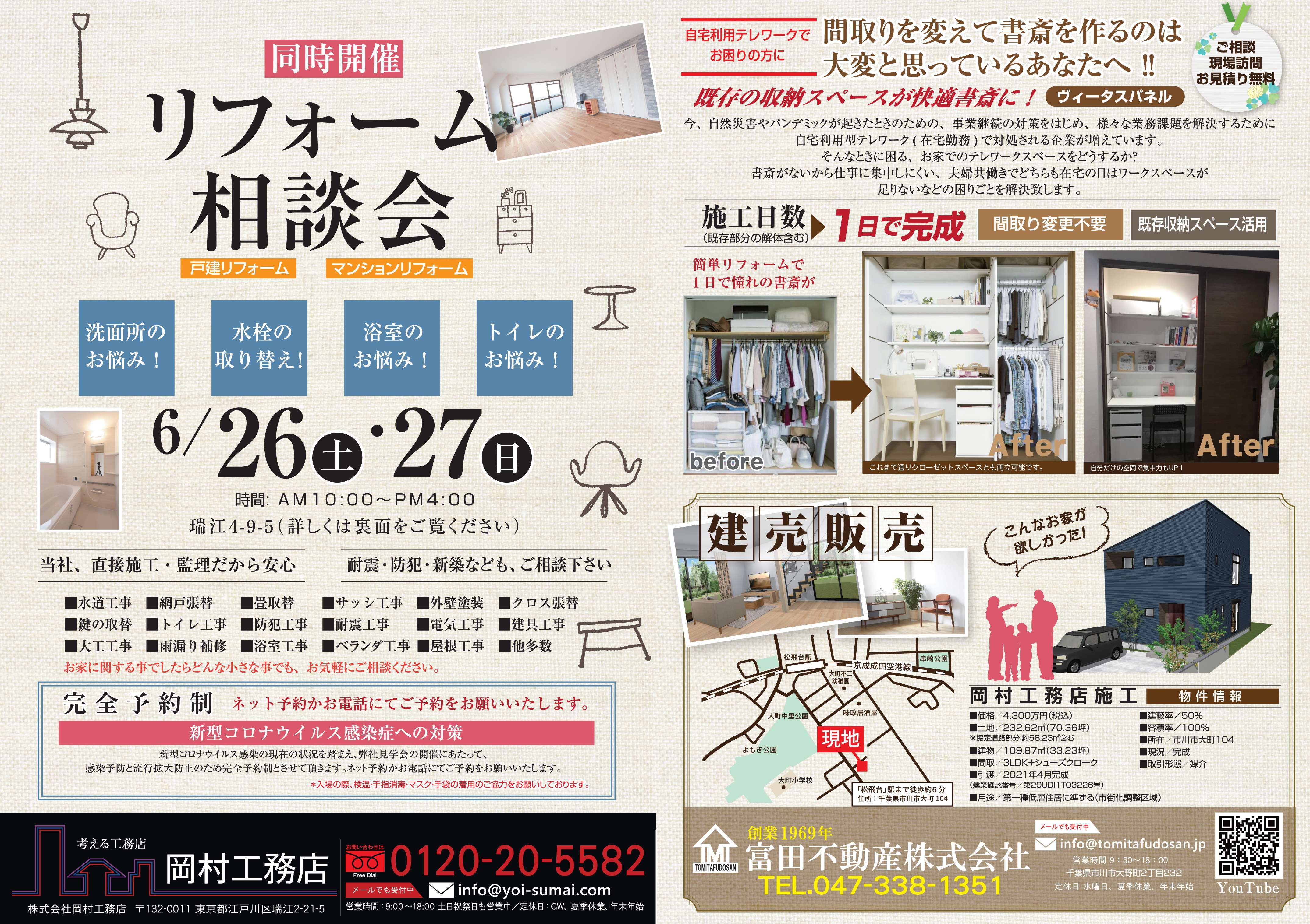 6月26日(土)・27日(日)2日間当社瑞江ショールームにて完成見学会、リフォーム相談会を開催します。15坪の敷地に、建坪9坪のお家+屋上庭園。9坪でゆとりある住空間が・・・。 水廻りはもちろんの事、小さな箇所の修理から大型リフォームまで、リフォームを検討中のお客様にも参考にして頂けますので是非ご来場ください。今回も新型コロナウイルス感染症予防対策として、完全予約制とさせて頂きます。ネットかお電話にてご予約お待ちしております。当日ご都合の悪いお客様は、他の日程でのご予約も承っております。