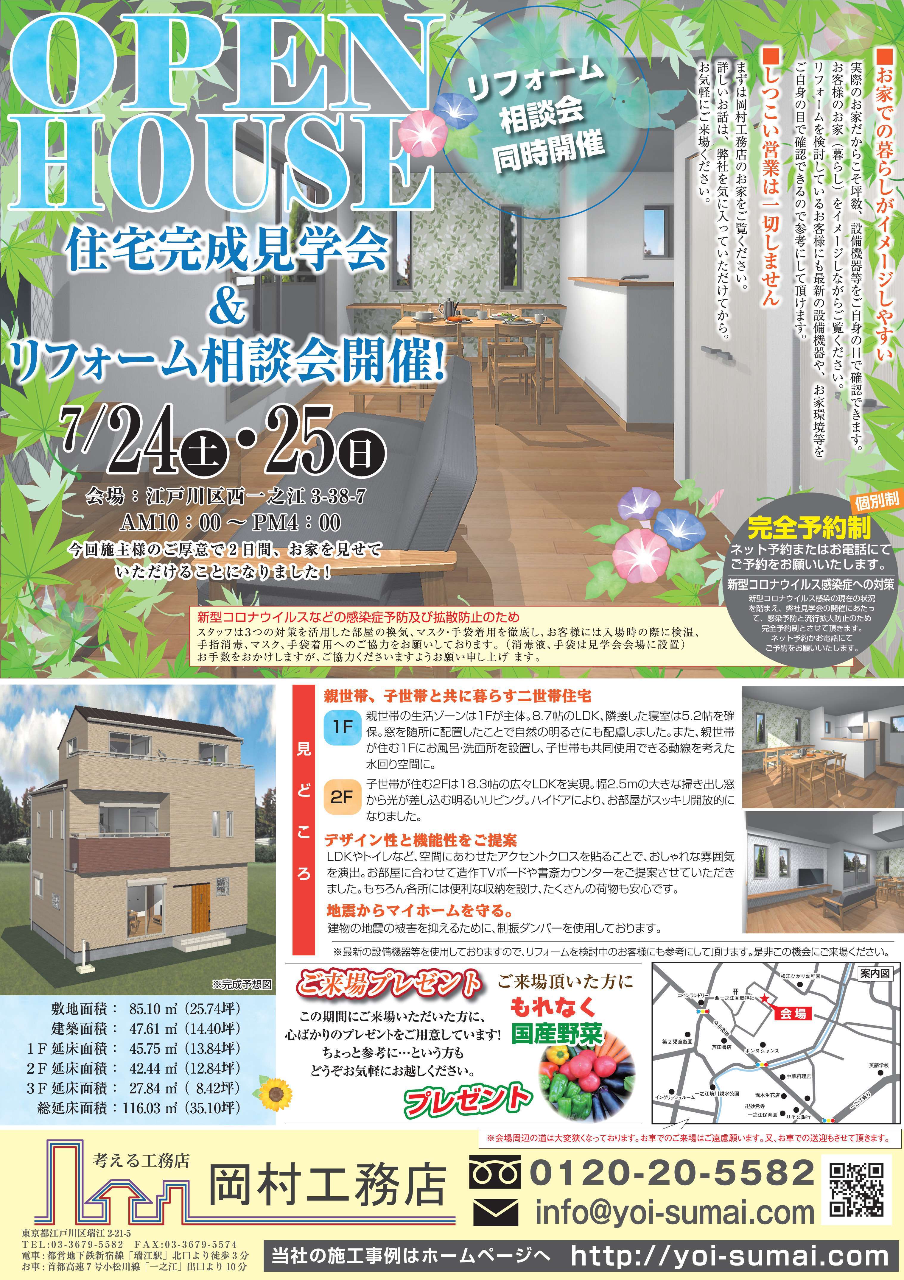 7月24日(土)~25日(日)、江戸川区西一之江にて完成新築現場見学会・リフォーム相談会を開催します。今回のお家は、家族構成やライフスタイルなど親世帯と子世帯の様々な暮らしに対応する二世帯住宅。玄関とお風呂・洗面所だけを一緒にした「部分共有」スタイルになっています。便利で快適な暮らしを実現。注文住宅だからできたこだわりの詰まったお家をご覧ください。実際にお住まいをご覧いただき、無料でお客さまのご相談・お悩みにお応えいたします。ちょっと参考に・・・という方もどうぞお気軽にお越しください。皆様のご来場をスタッフ一同お待ちしております。今回の見学会は、新型コロナウイルス感染予防の為、予約制とさせていただきます(当日の予約OK)。下記よりお問い合わせください。またご来場の際には、入口での検温・手指消毒・マスク、手袋の着用のご協力をお願いしております。何卒ご理解とご協力のほどお願い致します。