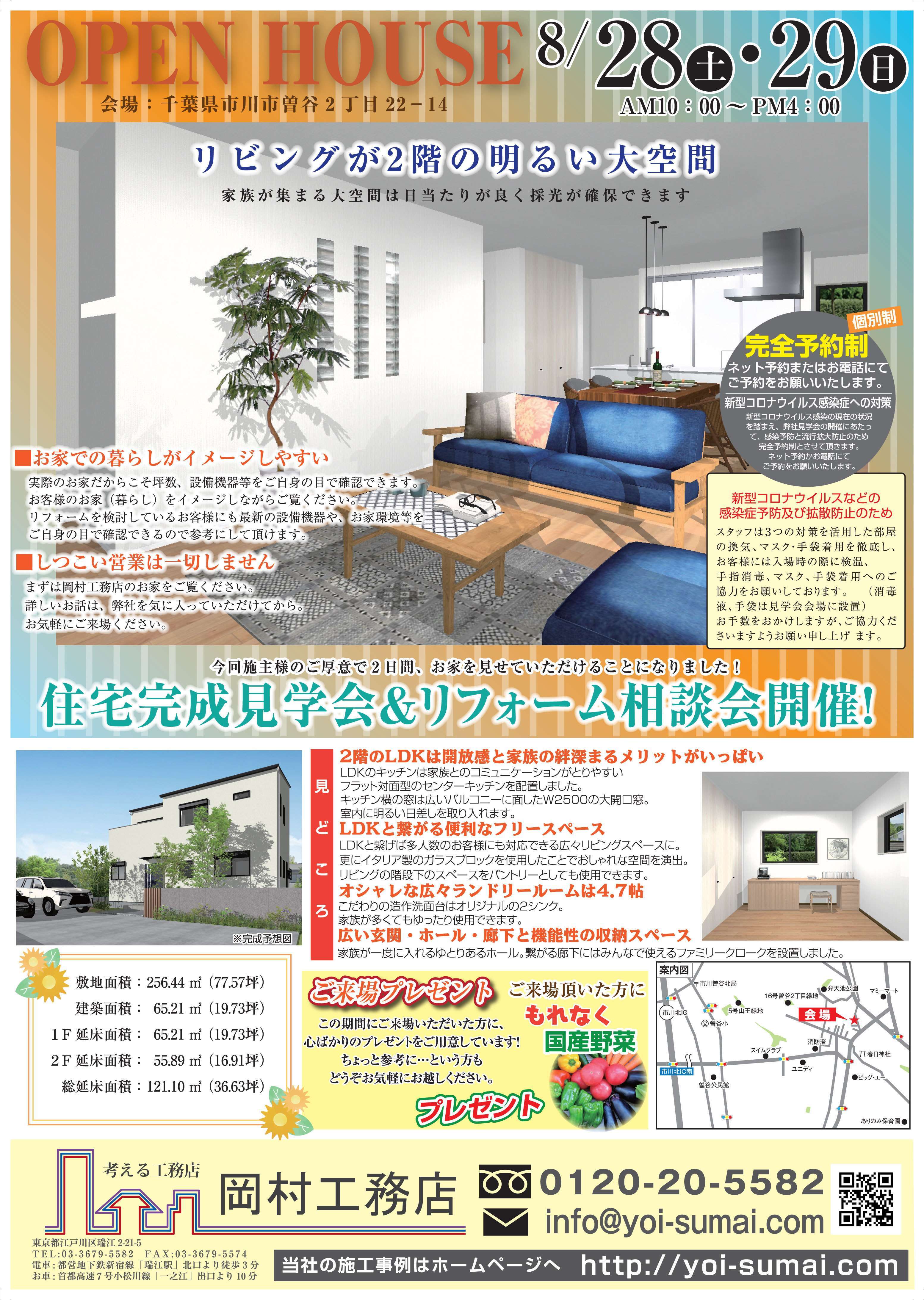 8月28日(土)~29日(日)、市川市曽谷にて完成新築現場見学会・リフォーム相談会を開催します。
