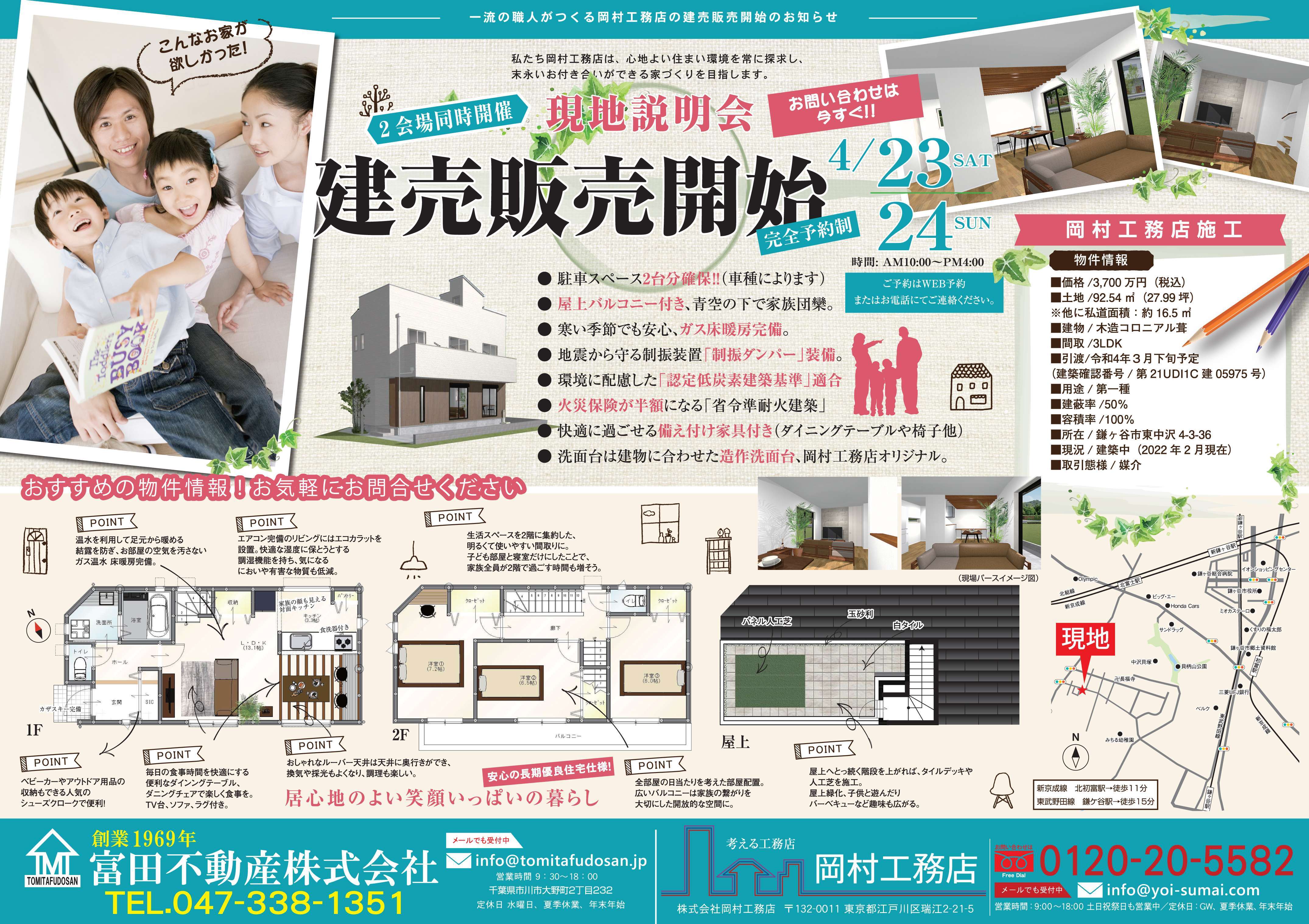 4月23日(土)~24日(日)、江戸川区北葛西にて完成新築現場見学会・リフォーム相談会、