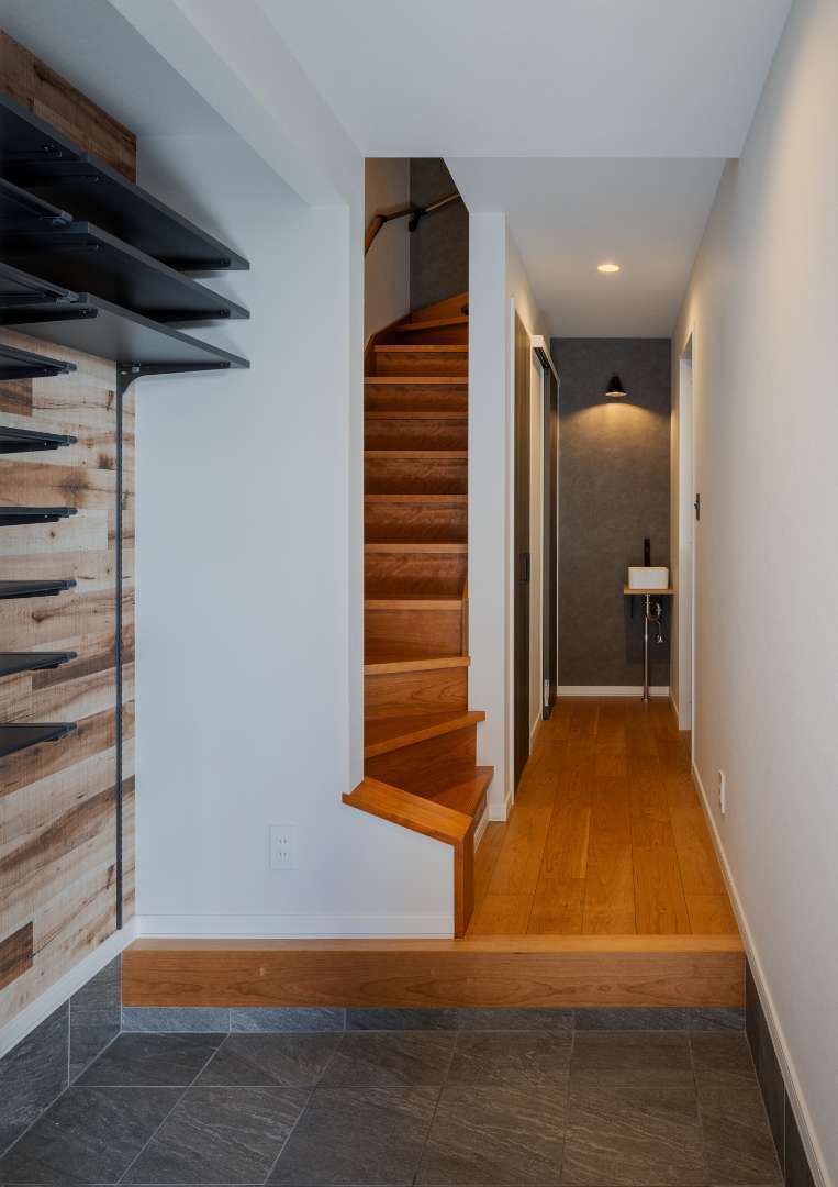 落ち着いたグレーの石目調タイルと、温かみのある木目のコントラストが印象的。 壁一面にあしらわれたウッドパネル風のアクセントが、空間に「木の温もり」と「上質な奥行き」を与え、3階建ての豊かな暮らしを予感させてくれます。