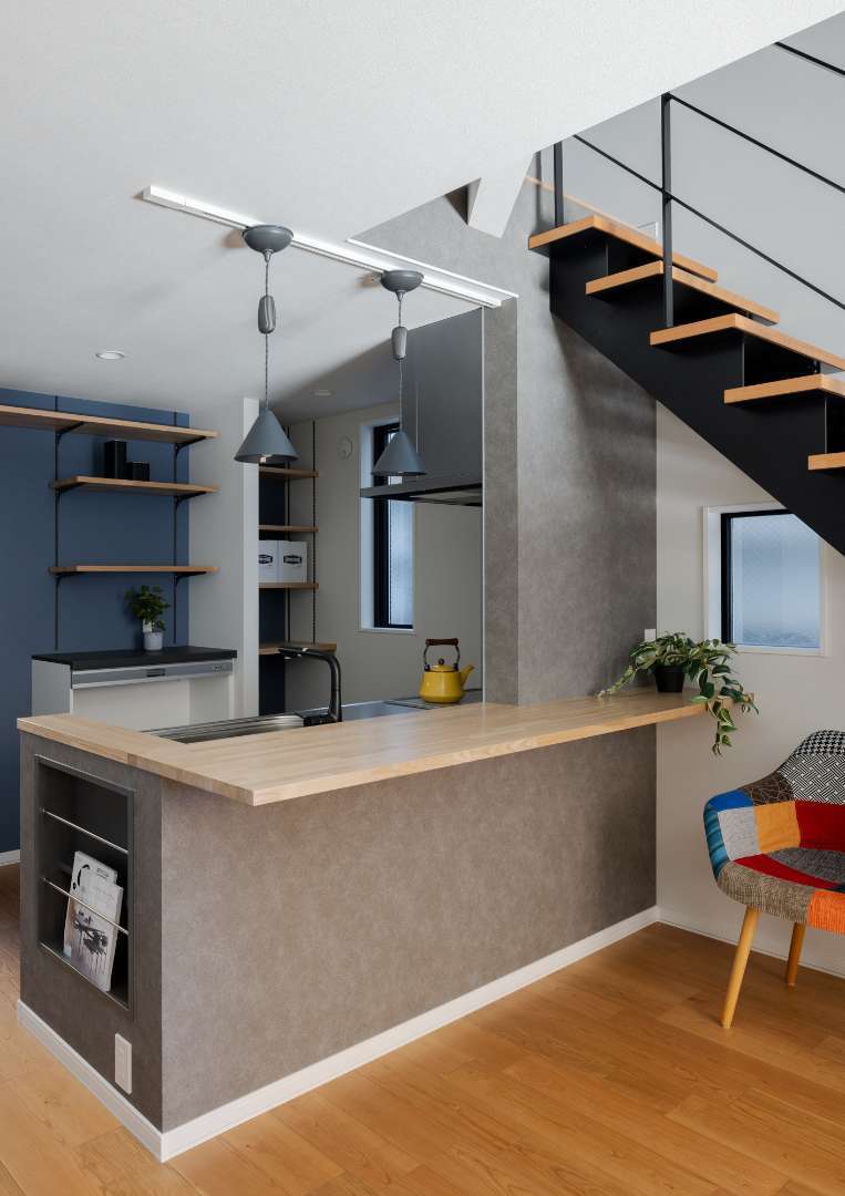コンクリート調のグレーの腰壁に、温かみのある木目のワークトップを組み合わせた、スタイリッシュな対面式キッチン。 背面の壁には深みのあるブルーをアクセントカラーとして採用し、ブラケット棚(見せる収納)を配置。お気に入りのキッチンツールやグリーンを飾ることで、毎日の料理の時間がより愉しくなるような、カフェのような空間に仕上げました。