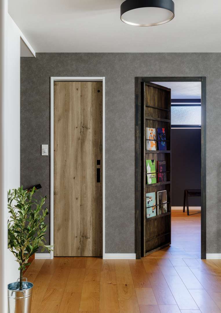 遊び心溢れる設計として、一見するとブックシェルフに見える「隠し扉」を採用。実用性とデザイン性を兼ね備え、住まいの中にワクワクするような仕掛けをプラスしました。