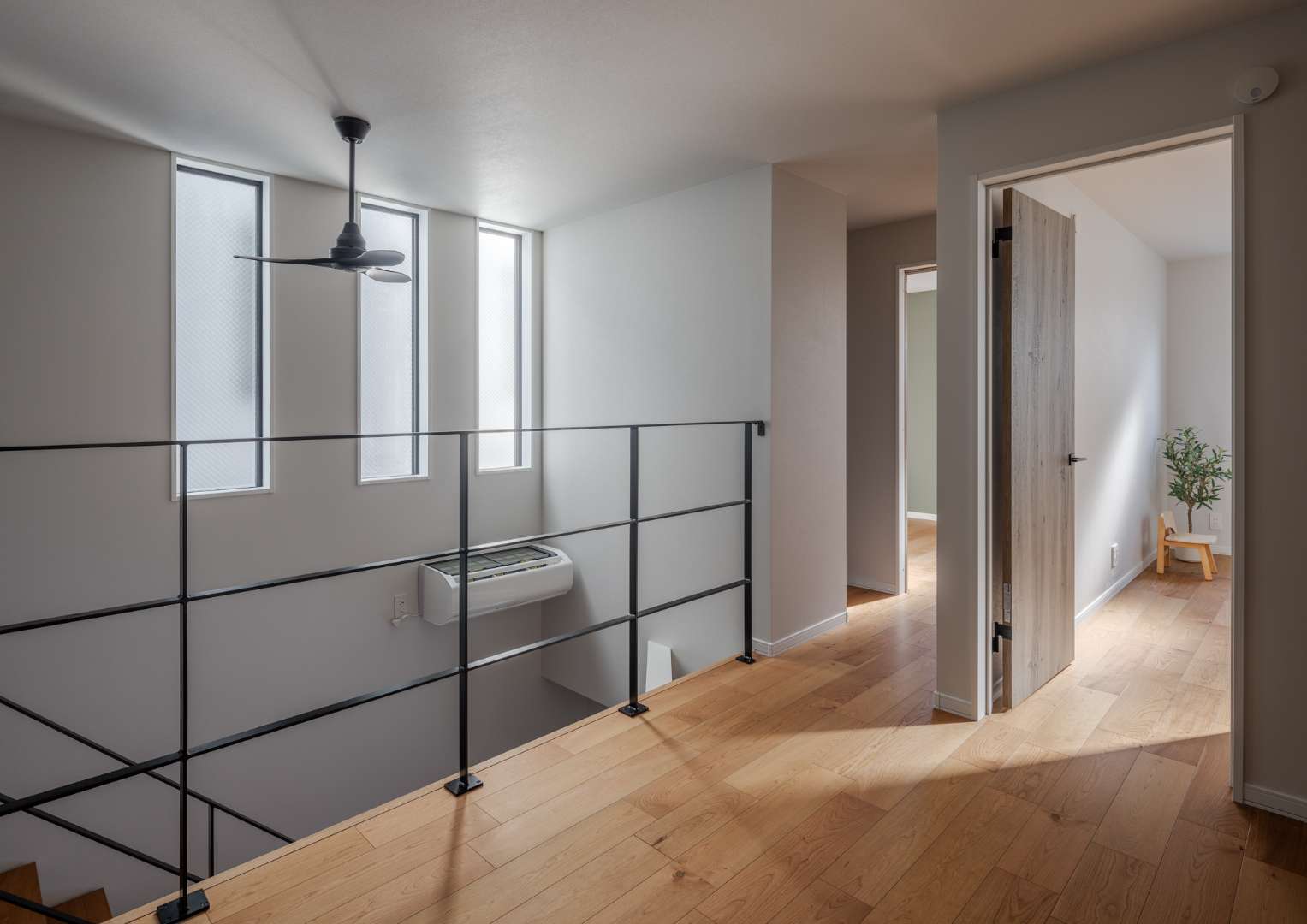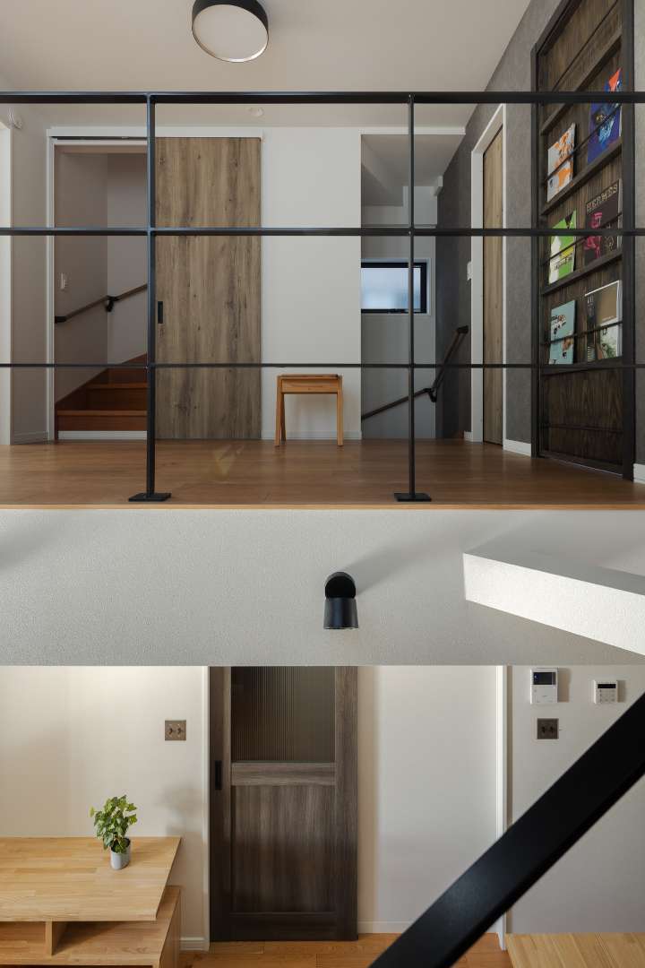 2階のホールには、細みのブラックアイアンを使用したスケルトン手摺を採用。視線を遮らないデザインにすることで、限られたスペースに圧倒的な開放感をもたらしています。