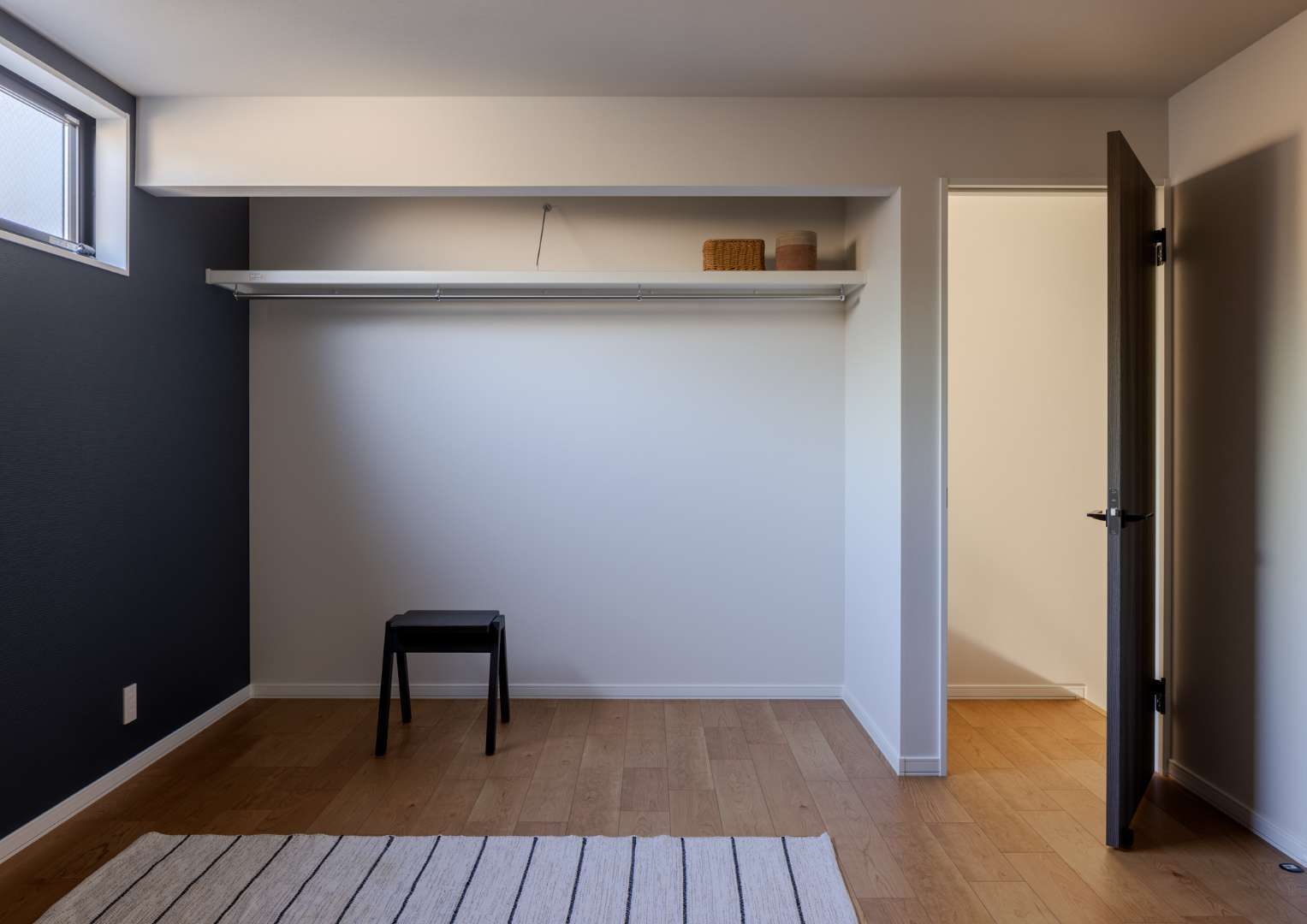 壁一面に深いネイビーのアクセントクロスを採用し、落ち着きのある「静」の空間を演出しました。 機能面では大容量のオープンクローゼットを設置。高い位置に設けた横長の窓からは、プライバシーを守りつつ、柔らかな光を取り込めます。