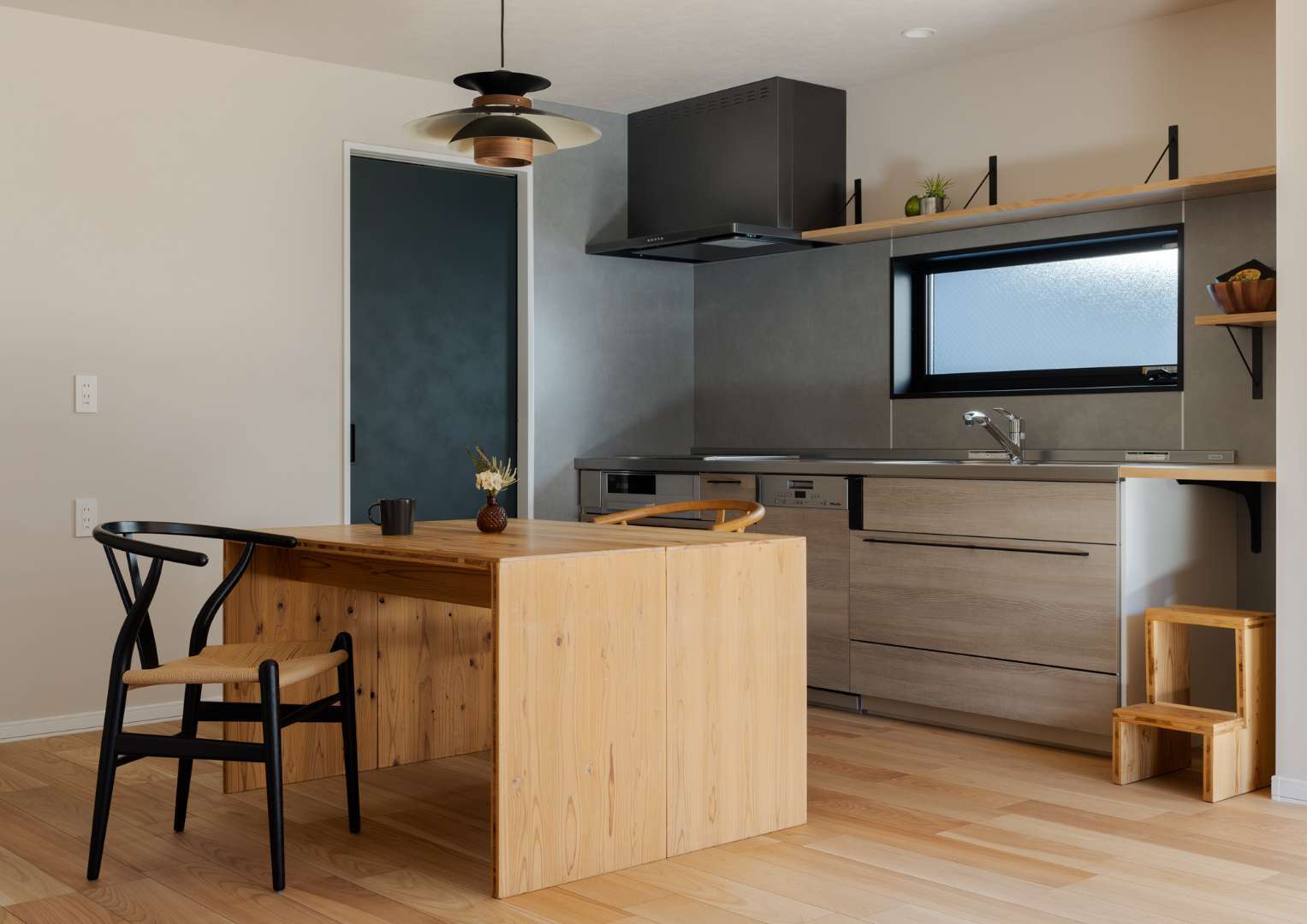 3階のキッチンは少しトーンを抑えた、安らぎを感じるグレージュや木目を中心に構成。キッチンのすぐ横に配置された木の温もり溢れるダイニングテーブルは、配膳や片付けが数歩で完結する機能的なレイアウトです。照明には北欧テイストのペンダントライトを合わせ、温かな光の下で夫婦の会話が弾む、穏やかな食卓を演出しました。