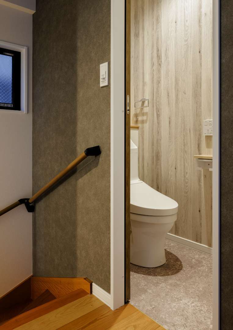 扉を開けると、温かみのある縦木目のアクセントウォールが目を引きます。床には落ち着いた質感のデザインタイルを合わせ、壁のグレーのテクスチャと調和させることで、単なる機能空間ではない「一部屋」としての完成度を高めています。